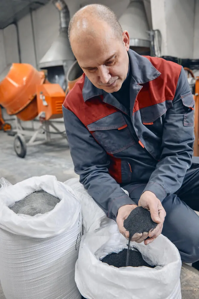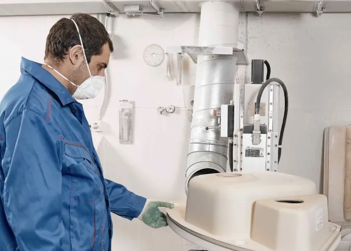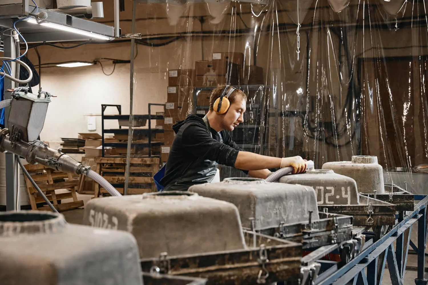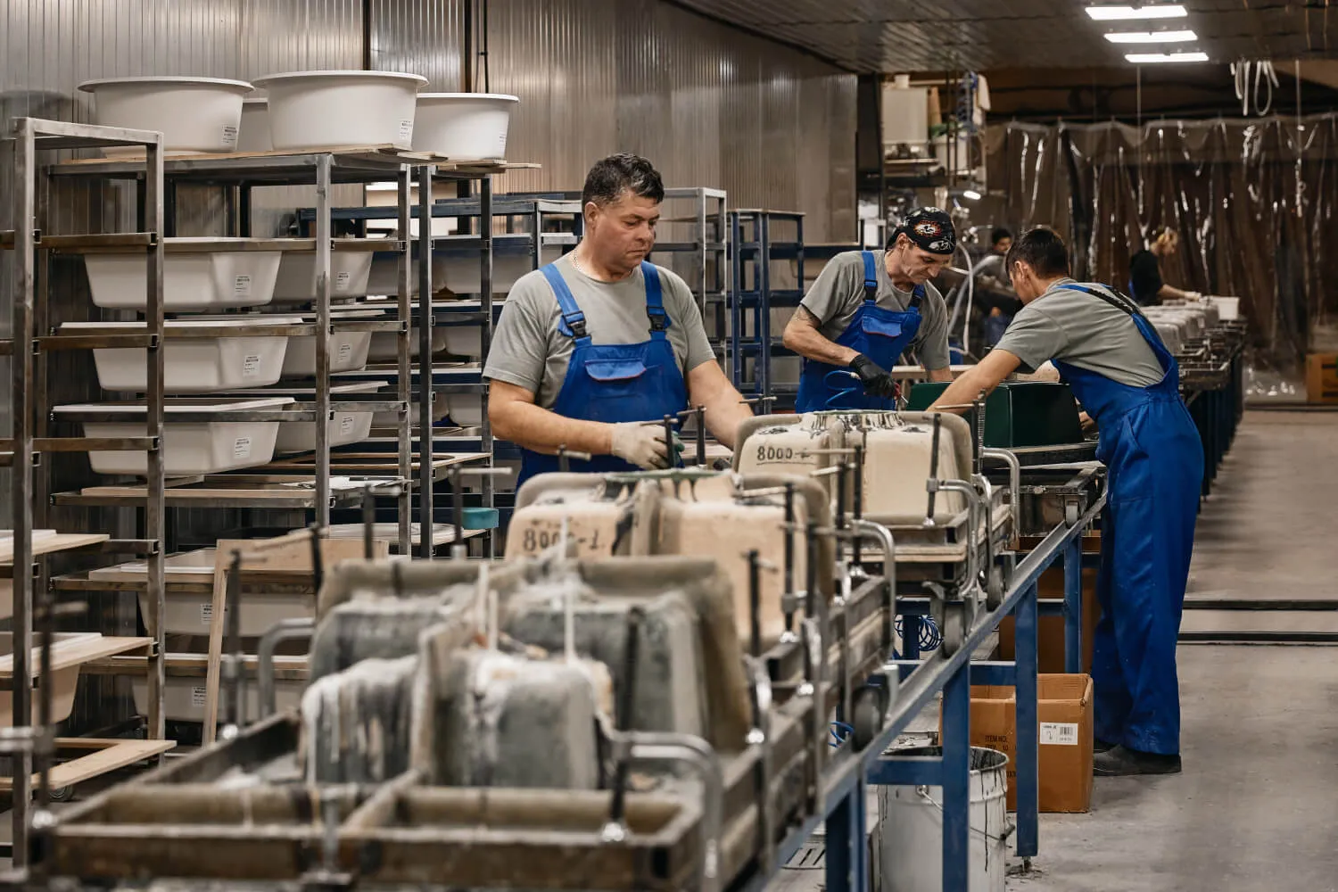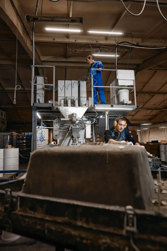 Далее MIX подается в бункер литьевой машины, также туда подается силанизированный наполнитель, ускоритель реакции и отвердитель. Далее литьевая машина автоматически дозирует, смешивает и подает композитную смесь под давлением в форму. Далее форма подается на вибро-линию , по конвейеру движется на расформовку где полуфабрикат извлекается из формы и устанавливается на стеллажи.